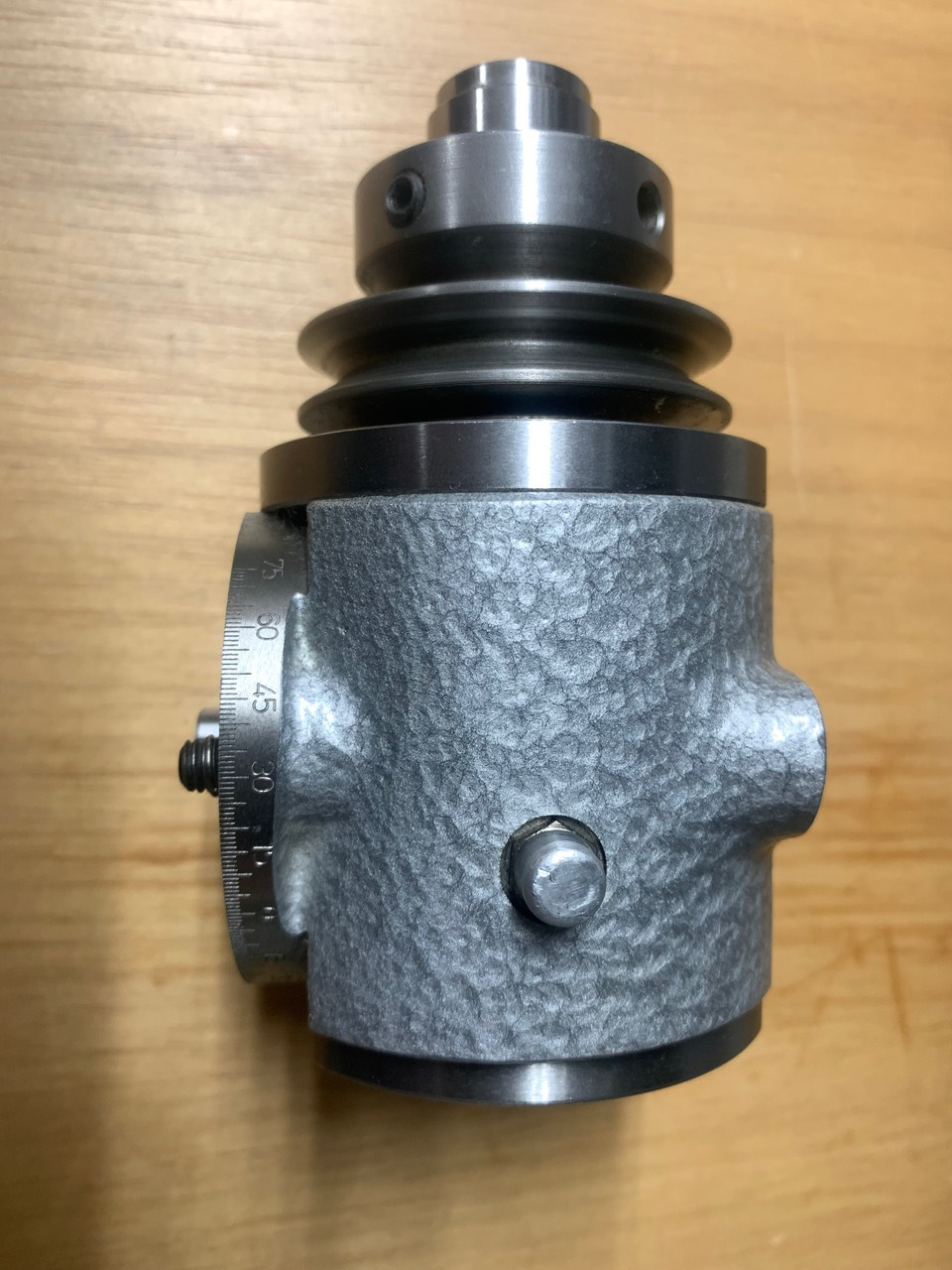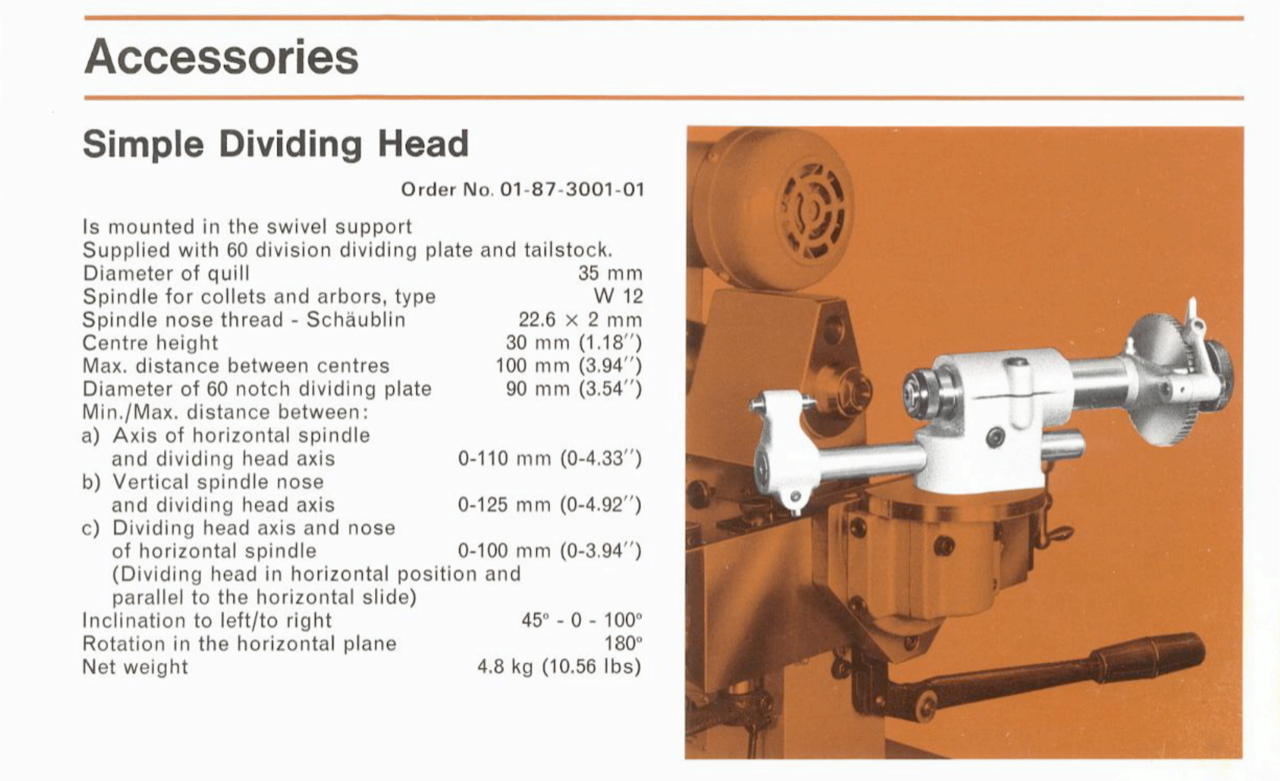 This accessory is a modern copy of the original Aciera F1 simple dividing head, made to the same design and specification. It is complete with an overarm, a 60 tooth indexing plate (72T available on request), drawbar and a spindle nose cap.
